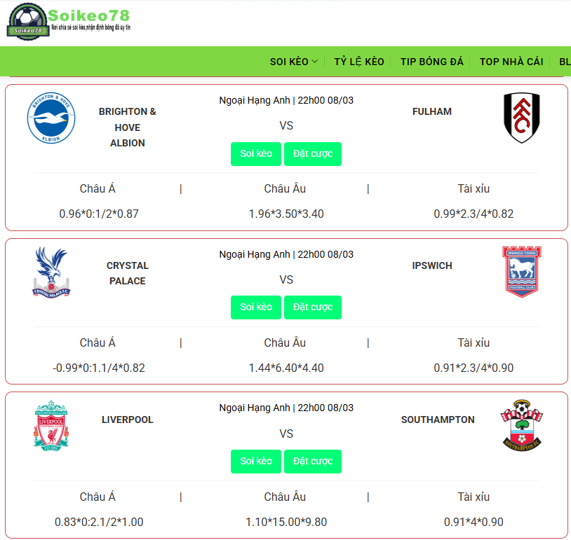 Các bảng tỷ lệ kèo nhà cái từ các chuyên gia hàng đầu tại website soikeo78