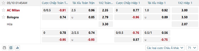 Bảng tỷ lệ kèo bóng đá AC Milan vs Bologna