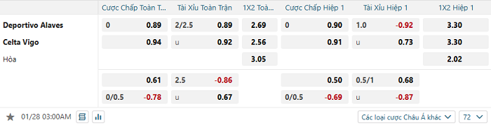 Bảng tỷ lệ kèo bóng đá Alaves vs Celta Vigo