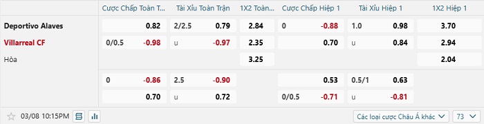 Bảng tỷ lệ kèo bóng đá Alaves vs Villarreal