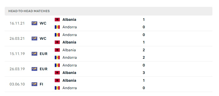 Lịch sử đối đầu Albania vs Andorra