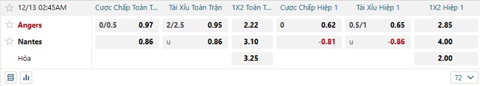 Trên thực tế, Angers lúc này hoàn toàn tự tin thắng kèo -1/4 một cách vô cùng dễ dàng. Bởi trong 8 trận đấu gần nhất của đội chủ nhà, họ chỉ có đúng 1 thất bại và còn lại là 7 trận toàn thắng kèo. Trong khi đó thì Nantes ở 6 trận đấu gần nhất, họ chỉ có 1 chiến thắng và thua 5. Do đó, kèo châu Á trận đấu hôm nay sẽ có đội chủ nhà Angers là lựa chọn đầu tư tốt nhất dành cho người hâm mộ.