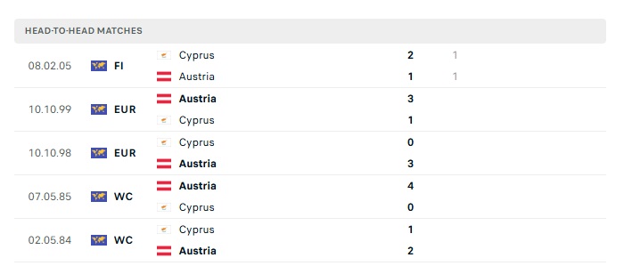 Lịch sử đối đầu Áo vs Síp