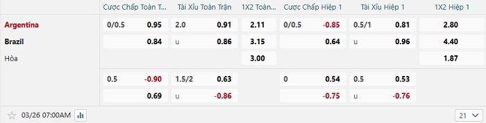 Bảng tỷ lệ kèo bóng đá Argentina vs Brazil