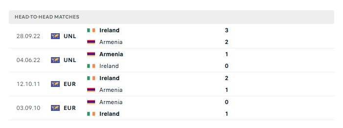 Lịch sử đối đầu Armenia vs Ireland