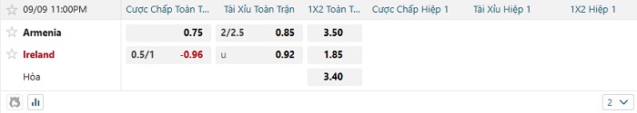 Bảng tỷ lệ kèo bóng đá hôm nay Armenia vs Ireland