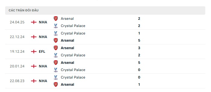 Lịch sử đối đầu Arsenal vs Crystal Palace