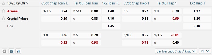 Bảng tỷ lệ kèo nhà cái Arsenal vs Crystal Palace