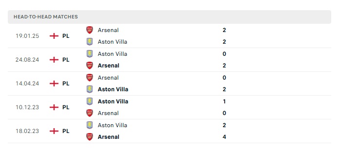 Lịch sử đối đầu Aston Villa vs Arsenal