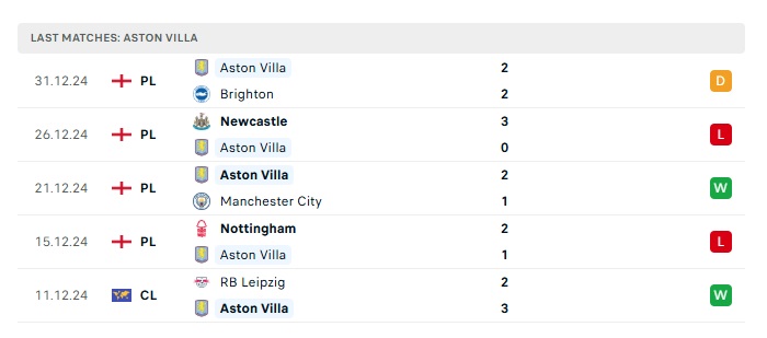 - Phong độ gần đây Aston Villa