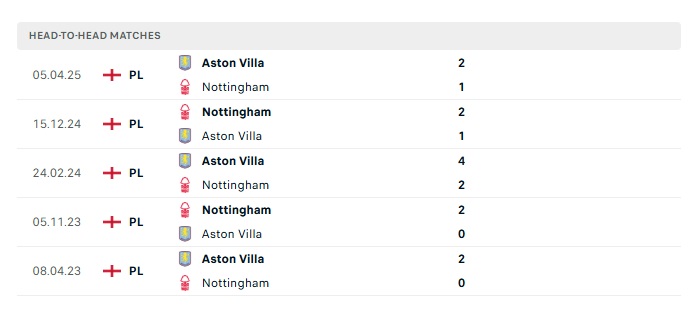 Lịch sử đối đầu Aston Villa vs Nottingham Forest