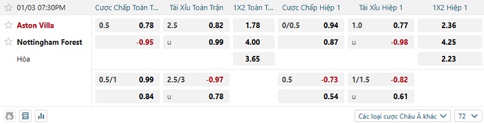 Bảng tỷ lệ kèo bóng đá Aston Villa vs Nottingham Forest