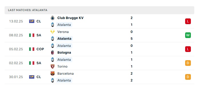 Phong độ gần đây Atalanta vs Club Brugge