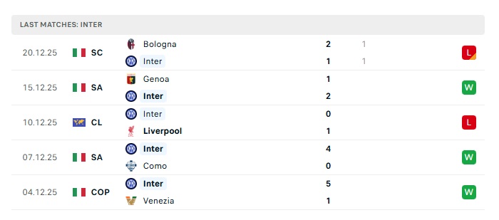 - Phong độ gần đây Inter Milan