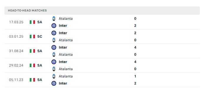 Lịch sử đối đầu Atalanta vs Inter Milan