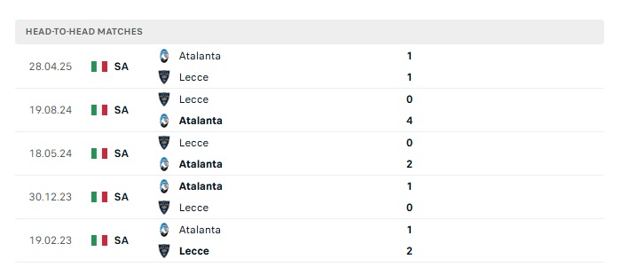 Lịch sử đối đầu Atalanta vs Lecce