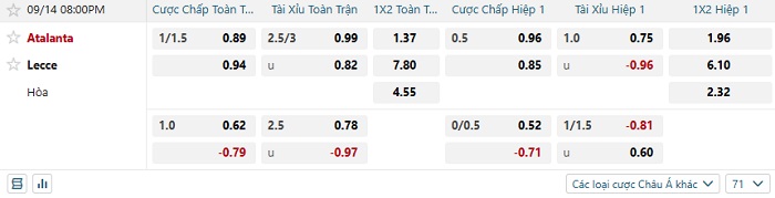 Bảng tỷ lệ kèo nhà cái Atalanta vs Lecce