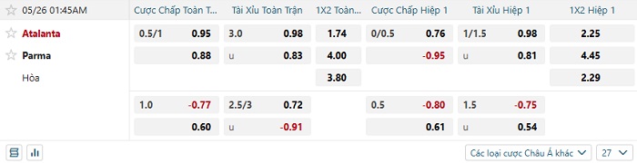 Bảng tỷ lệ kèo nhà cái Atalanta vs Parma