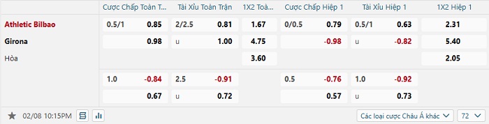 Bảng tỷ lệ kèo bóng đá Athletic Bilbao vs Girona