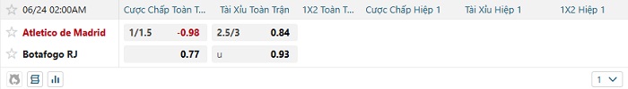 • Kèo tỷ số H1 Atletico Madrid vs Botafogo: 1-0