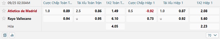 Bảng tỷ lệ kèo bóng đá Atletico Madrid vs Rayo Vallecano