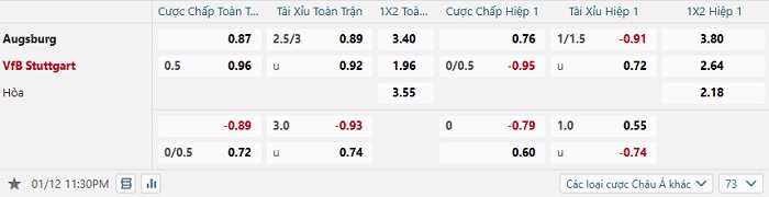 Bảng tỷ lệ kèo bóng đá Augsburg vs Stuttgart