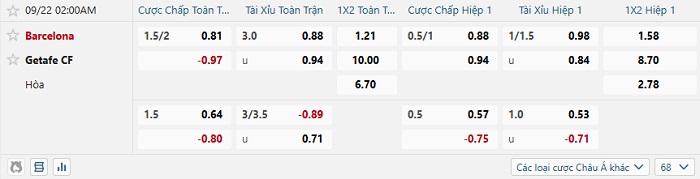 Hiện tại, nhà cái niêm yết cho Barcelona mức chấp -1 3/4 dù có hơi cao nhưng cũng không phải quá sức với họ. Nên biết rằng trong 10 trận gần nhất của Barcelona, họ đã có 7 chiến thắng và chỉ thua kèo 3. Trong khi đó thì 10 trận gần nhất của Getafe, họ chỉ thắng kèo 3 trận. Do đó, kèo châu Á trận đấu hôm nay sẽ có đội chủ nhà là lựa chọn tốt nhất trong cả 2 hiệp.