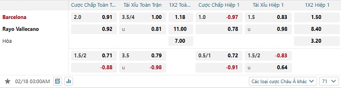 Bảng tỷ lệ kèo bóng đá Barcelona vs Rayo Vallecano