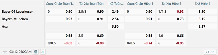 Bảng tỷ lệ kèo bóng đá Bayer Leverkusen vs Bayern Munich