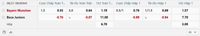 Bảng tỷ lệ kèo bóng đá Bayern Munich vs Boca Juniors
