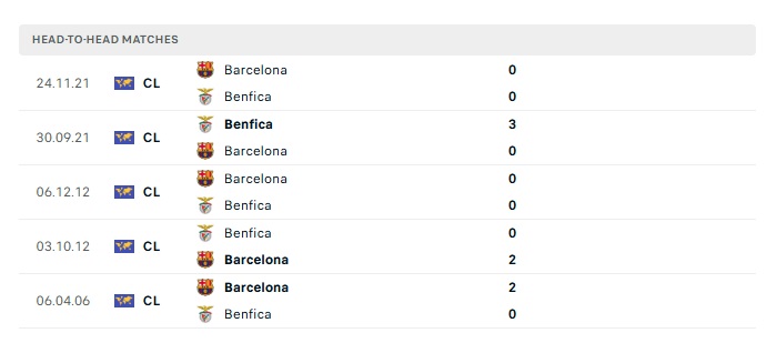 - Kèo tỷ số H2 Benfica vs Barcelona: 1-2