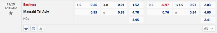 - Kèo tỷ số H1 Besiktas vs Maccabi TA: 1-0