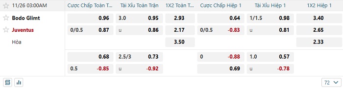 - Kèo tỷ số H2 Bodo Glimt vs Juventus: 0-1