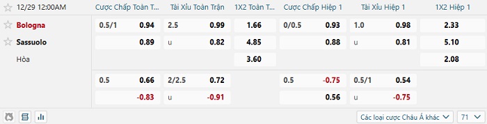 Soi kèo châu Á, kèo Bologna vs Sassuolo