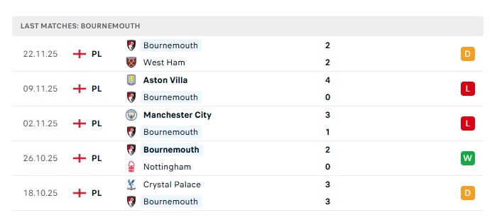 - Phong độ gần đây Bournemouth