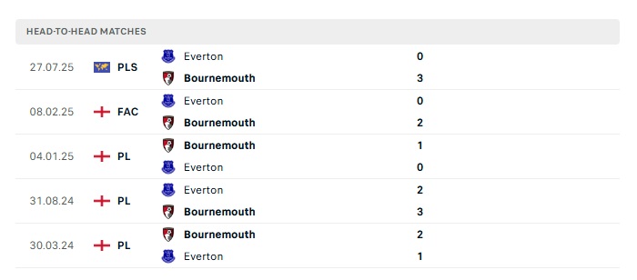 Lịch sử đối đầu Bournemouth vs Everton