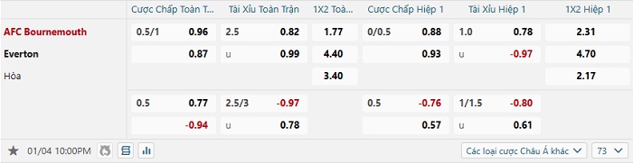 Hiện tại, nhà cái niêm yết cho Bournemouth là một mức tỷ lệ cho thấy rất rõ sự chênh lệch lớn giữa hai đội. Nên biết rằng Bournemouth trong 7 trận đấu gần nhất, họ đã có 5 trận thắng kèo và chỉ thua 2. Ngoài ra, trong 8 lần đụng độ nhau gần nhất của hai đội, Everton chỉ có đúng 1 lần thắng kèo. Thế nên các chuyên gia đều khẳng định rằng đội chủ nhà ngày hôm nay sẽ là lựa chọn tốt nhất trong cả 2 hiệp.