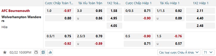 Bảng tỷ lệ kèo bóng đá Bournemouth vs Wolves