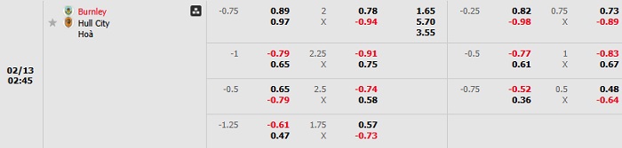 Bảng tỷ lệ kèo bóng đá Burnley vs Hull City