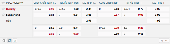 Bảng tỷ lệ kèo bóng đá Burnley vs Sunderland