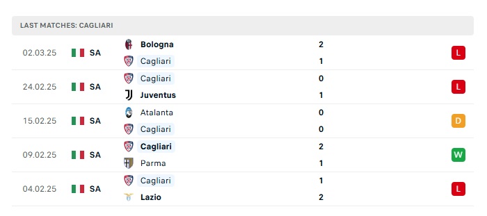 - Phong độ gần đây Cagliari