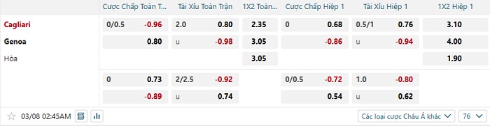 Bảng tỷ lệ kèo bóng đá Cagliari vs Genoa