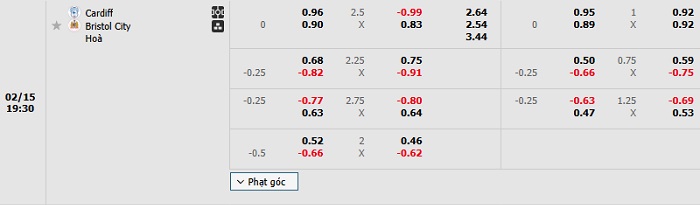 Bảng tỷ lệ kèo bóng đá Cardiff City vs Bristol City