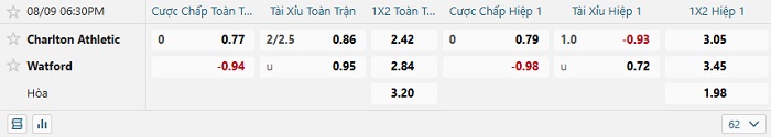 Bảng tỷ lệ kèo bóng đá Charlton Athletic vs Watford