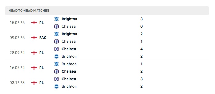 Lịch sử đối đầu Chelsea vs Brighton