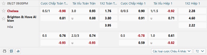 Bảng tỷ lệ kèo bóng đá hôm nay Chelsea vs Brighton