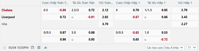Bảng kèo bóng đá Chelsea vs Liverpool