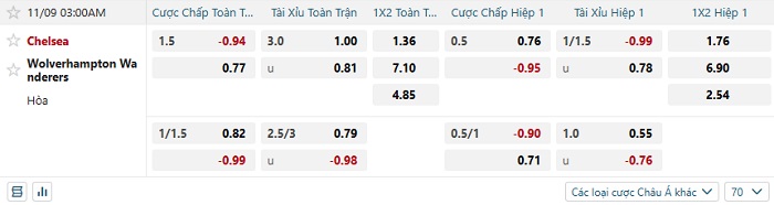 - Kèo tỷ số H1 Chelsea vs Wolves: 1-0