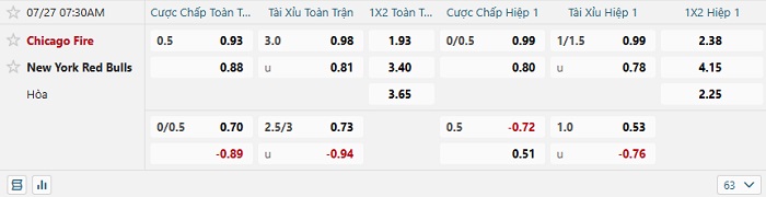 - Kèo tỷ số H1 Chicago Fire vs New York RB: 0-0