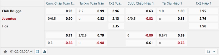 Bảng tỷ lệ kèo bóng đá Club Brugge vs Juventus